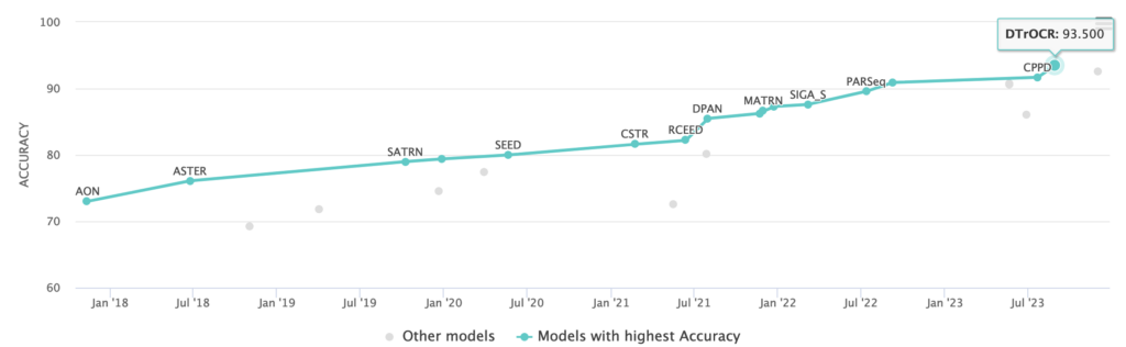 If you are looking for a model to immediately try out on a more serious task, a good starting point I can recommend from experience is the PARSeq model. It was State-of-the-Art, meaning it was first on most benchmarks, in 2022. However, in the time since it as only been superseded by a few percent points, so it remains relevant in 2024 as well.